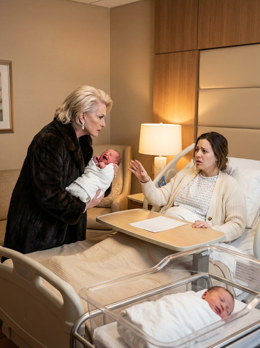 Ich hatte gerade einen Notkaiserschnitt überstanden, als meine Schwiegermutter in mein Zimmer kam, mir Adoptionspapiere aufs Bett warf und mir ruhig mitteilte, dass sie meinen neugeborenen Sohn als ihre Tochter nehmen würde. Dann bezeichnete sie mich als psychisch labil und versuchte, den Sicherheitsdienst gegen mich aufzubringen. Was sie nicht wusste: Ich hatte jahrelang meine wahre Identität verborgen – und in dem Moment, als der Chef meinen Namen erkannte, veränderte sich die Stimmung im Raum schlagartig.
