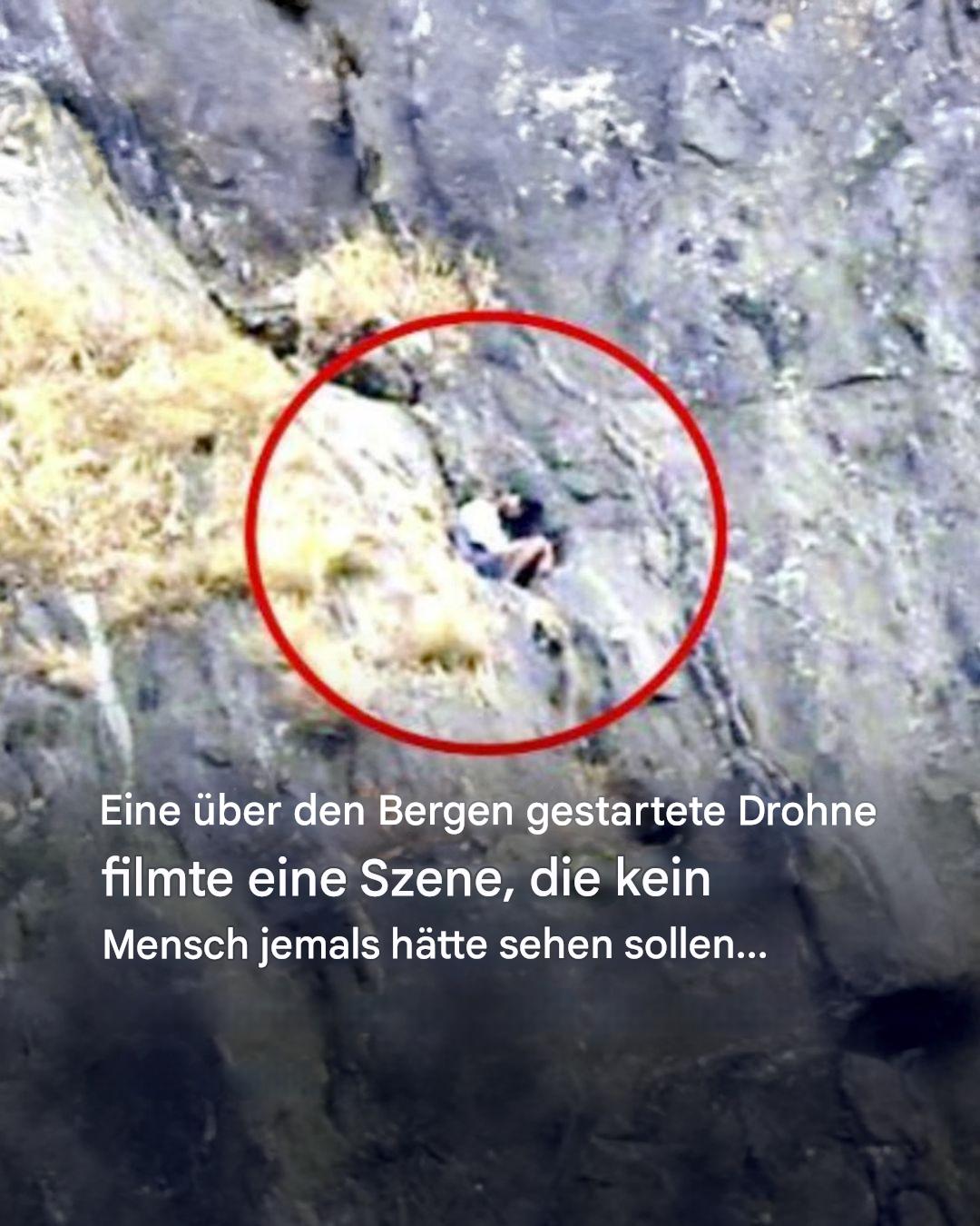 Auf dem Bild sieht man eine steile Felswand in den Bergen. In dem roten Kreis erkennt man offenbar eine Person, die auf einem schmalen Felsvorsprung sitzt oder liegt. Die Aufnahme wirkt wie aus größerer Entfernung – vermutlich von einer Drohne oder mit starkem Zoom gemacht.